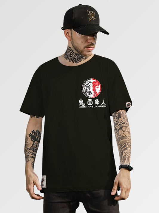 El cuello redondo y el corte clásico de la camiseta con motivos japoneses se adapta a todas las morfologías. Para un look sobrio, combina tu camiseta original con unos jeans ajustados