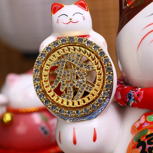 Los Maneki Neko suelen estar adornados con accesorios que refuerzan su simbolismo: